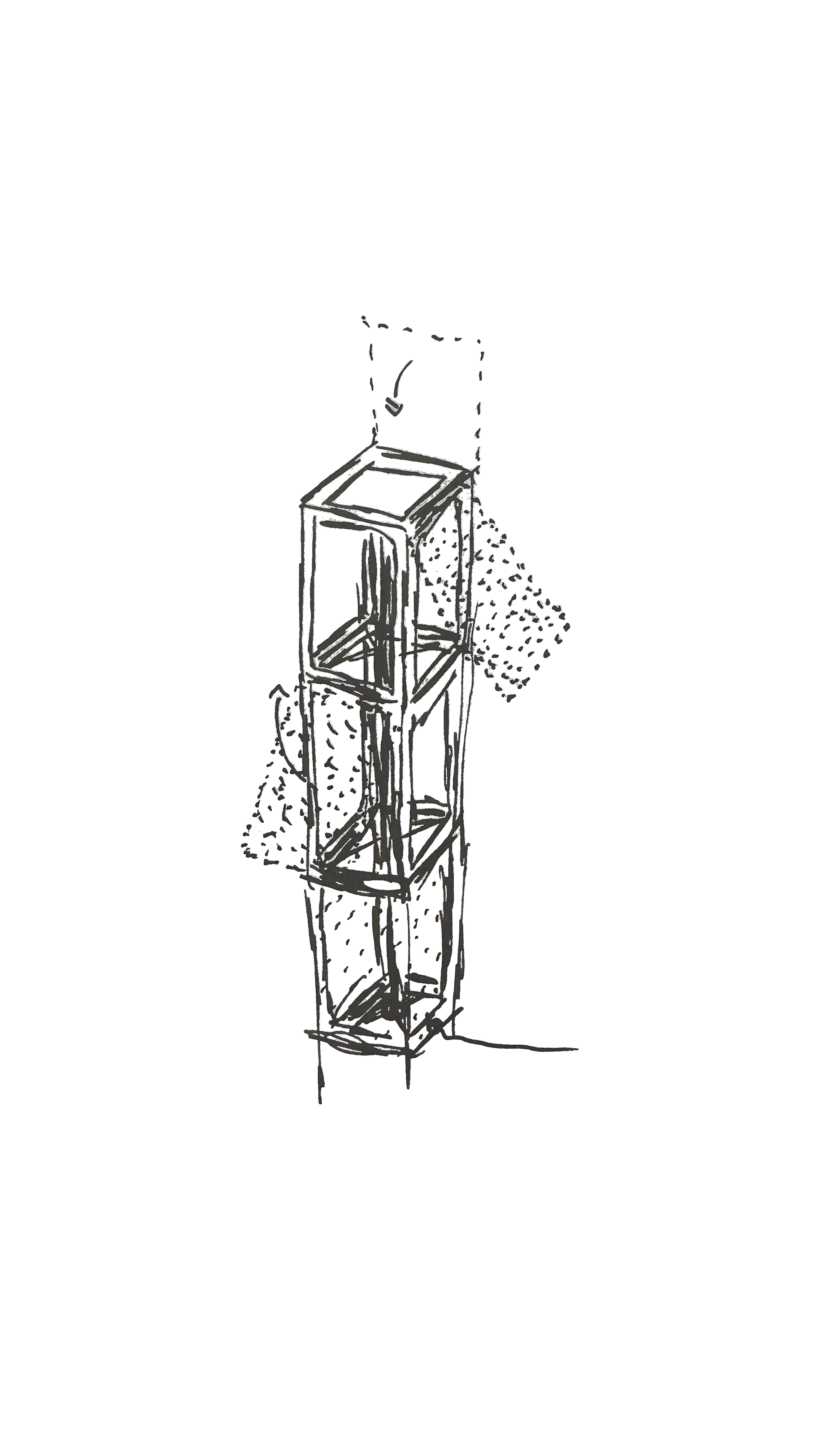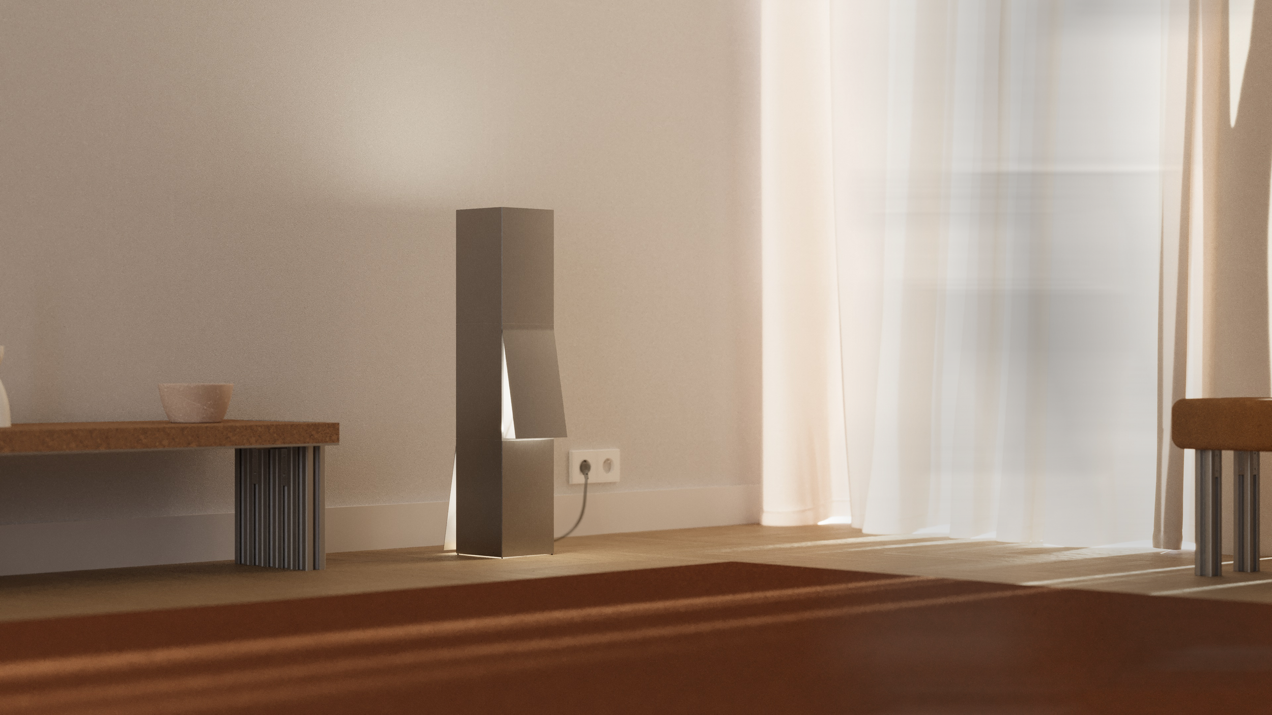 A modular floor lamp that explores the interplay between material contrasts and lighting atmospheres. The lamp focuses on a monolithic and technical appearance.
