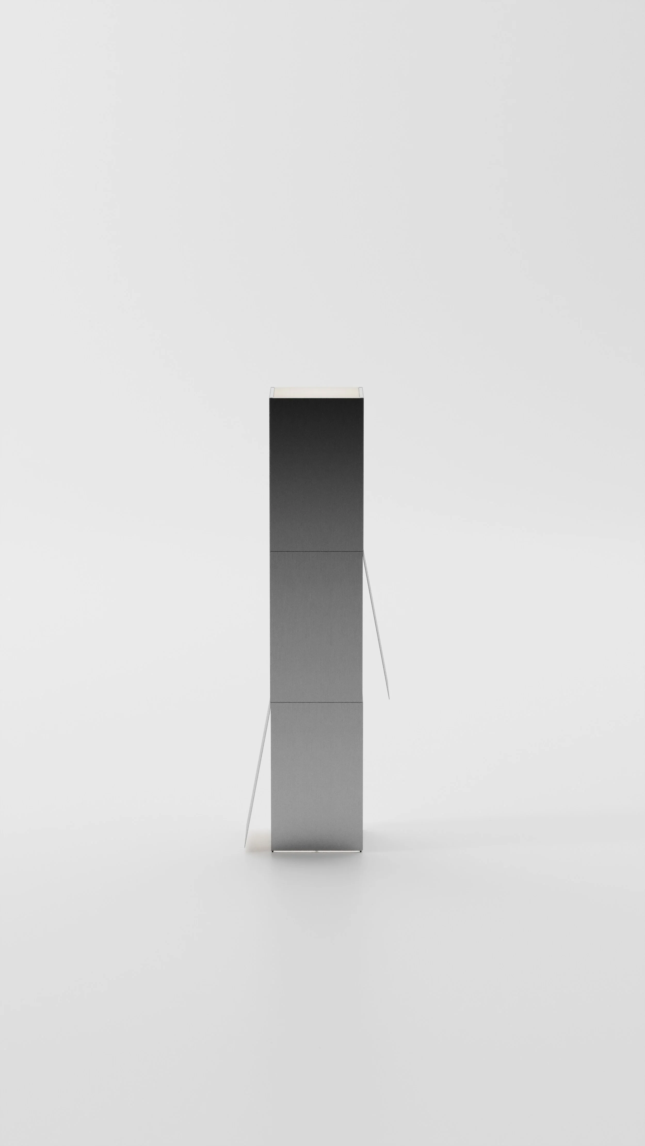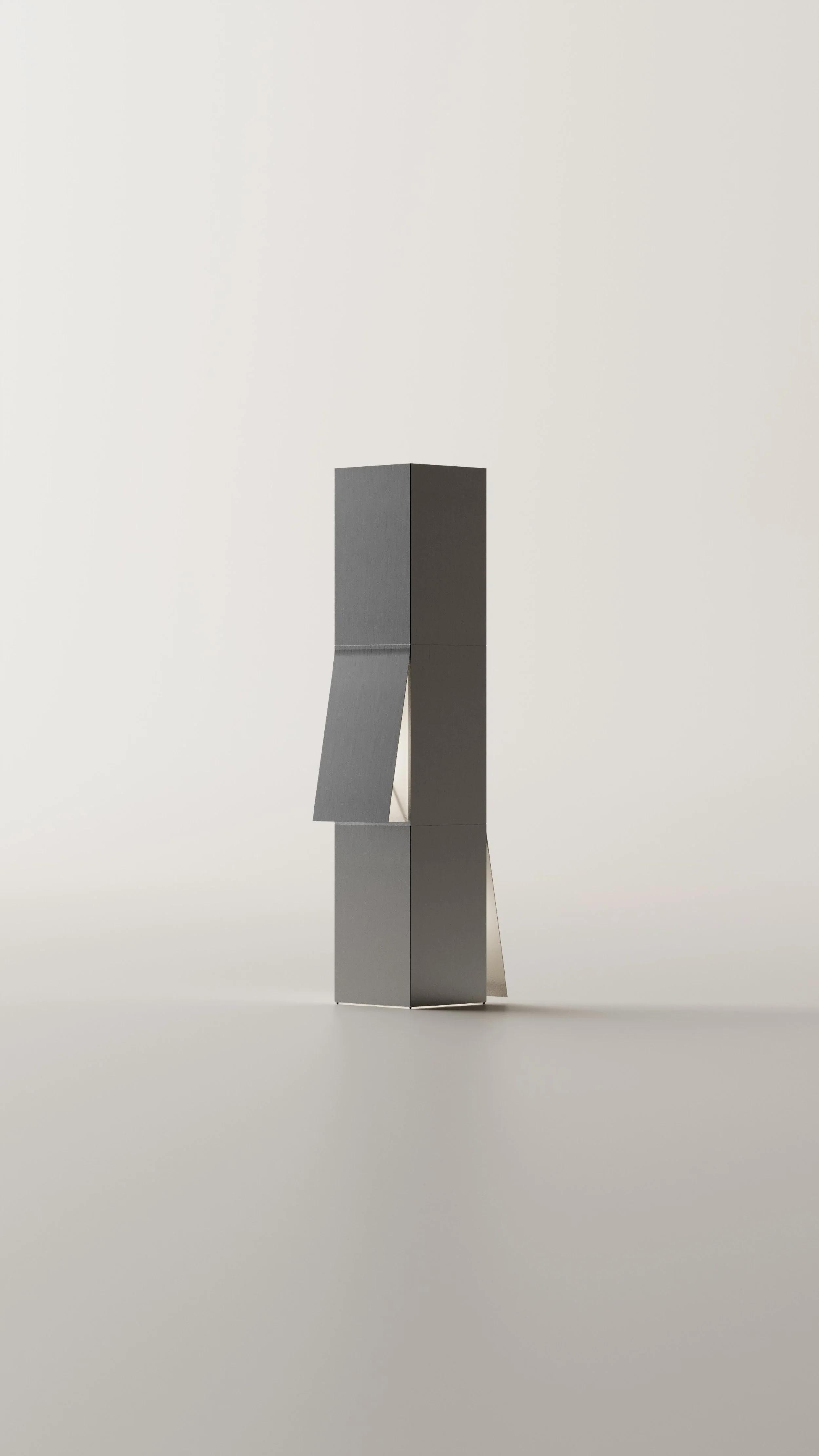 FL.02 is a modular floor lamp that explores the interplay between material contrasts and lighting atmospheres. Combining stainless steel, aluminum, and washi paper, the lamp balances a monolithic appearance with functional design. Its segmented structure and interchangeable front panels allow users to customize light diffusion and form, offering both sculptural presence and functional adaptability.