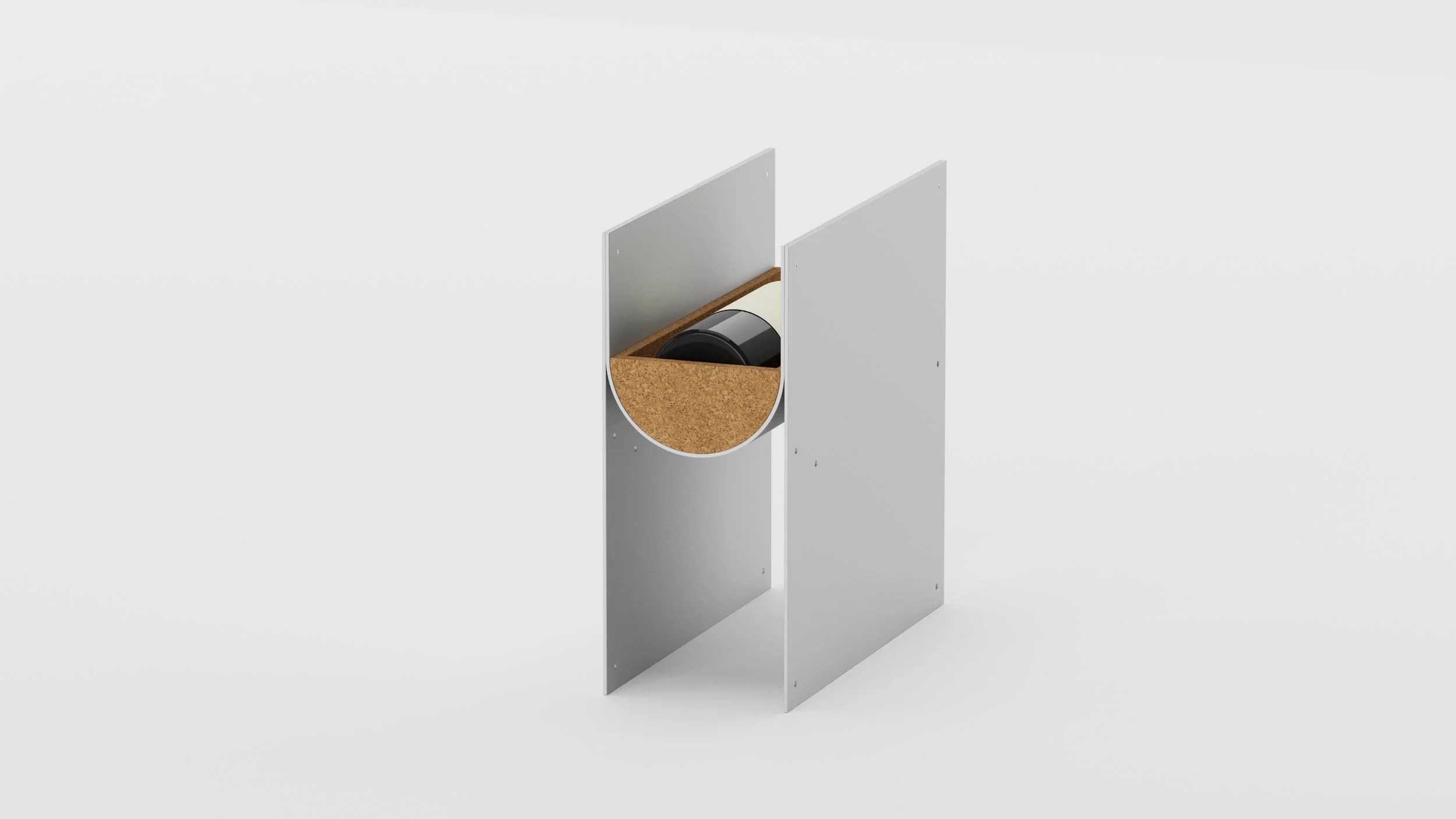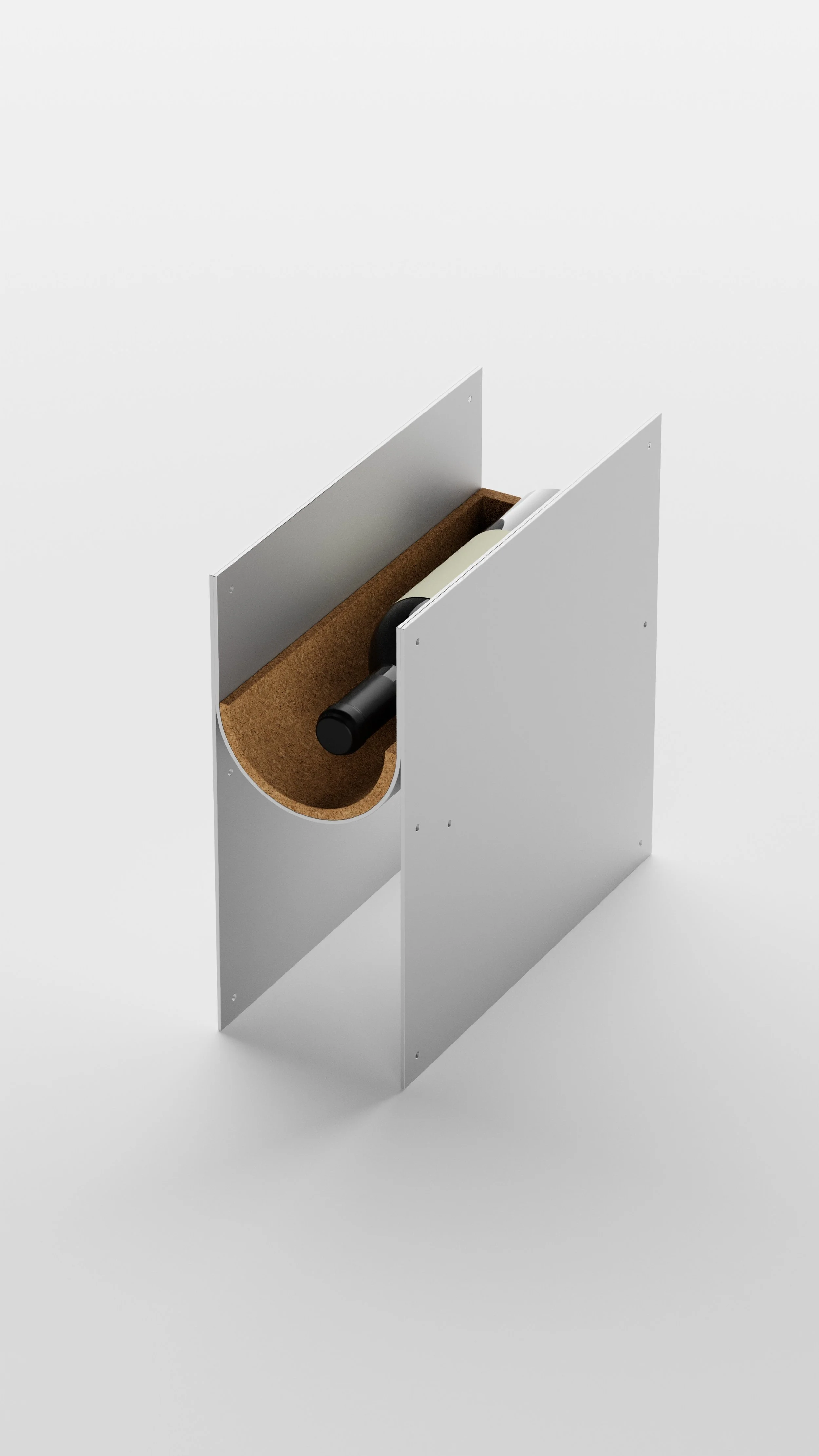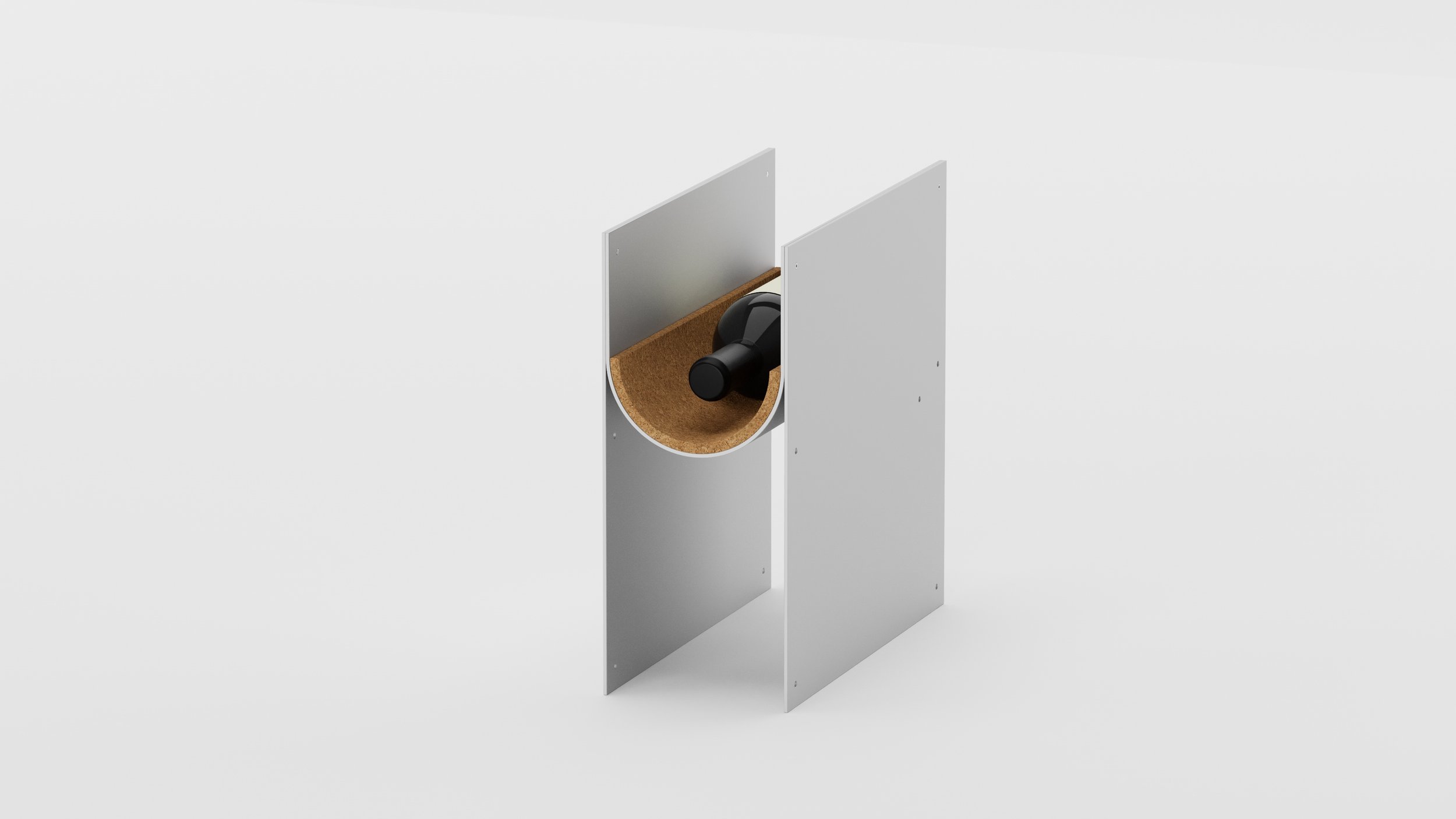 Each module consists of two parallel aluminum plates that hold a semi-cylindrical cork insert. The insert cradles the bottle and prevents slipping, ensuring secure placement even at an inclined angle. This modular structure enables both compact storage solutions and sculptural, wall-like wine displays adaptable to various spatial contexts.