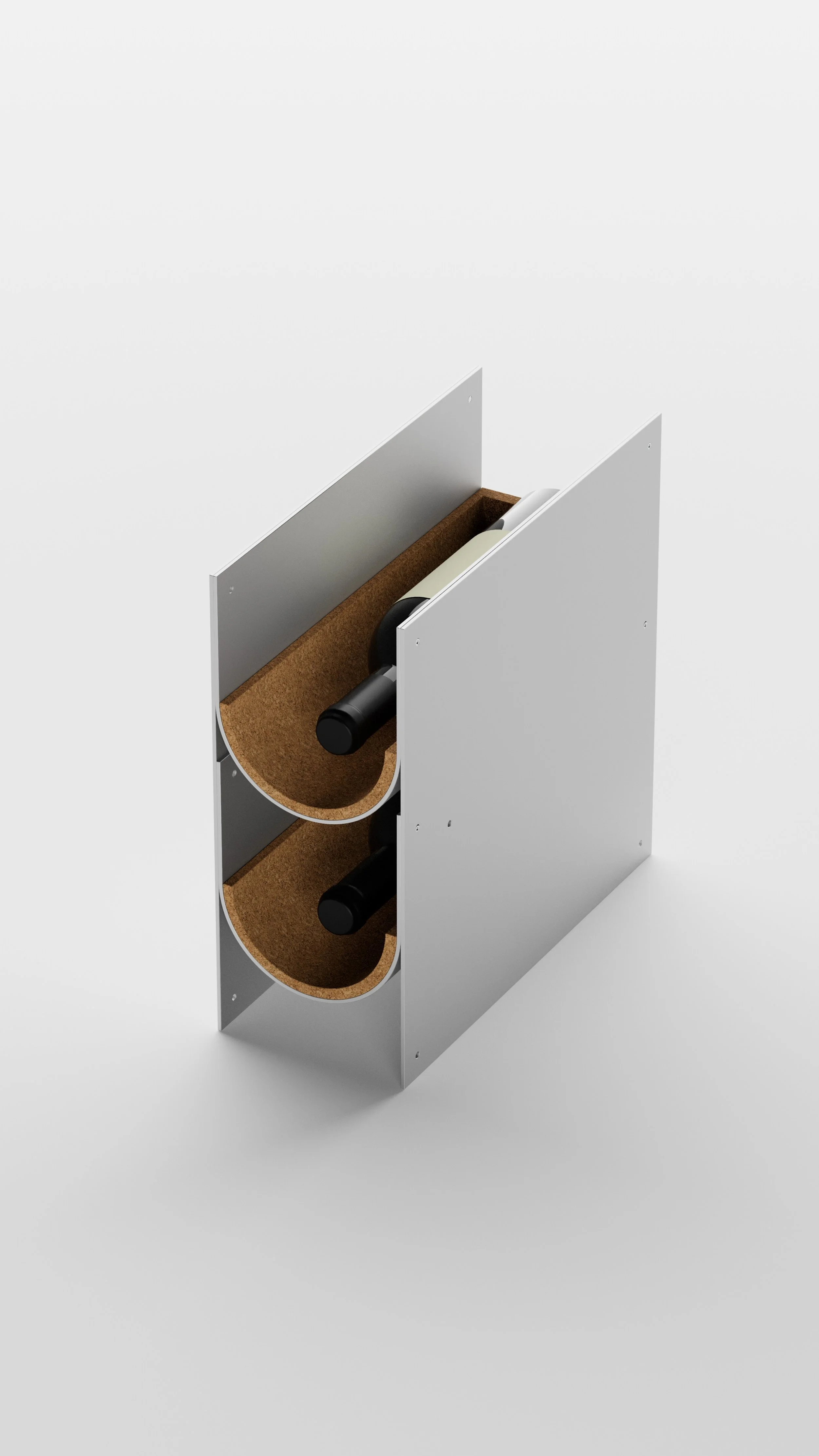 The wine rack is composed of modular units made from aluminum support plates and curved cork inserts. Each module accommodates a single bottle and can be configured in horizontal or vertical alignment. The aluminum provides structural stability and a refined, industrial aesthetic, while the cork insert ensures gentle and secure bottle storage.